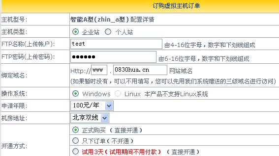 注意:如果您的会员号里有足够的款,开通方式可以选择"正式购买",这样,空间可以马上开空,并且马上投入使用。(如果域名未生效的,可以通过本站免费绑定的三级域名进行访问)