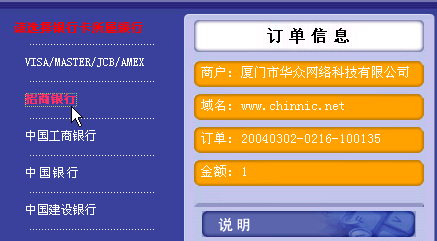 您汇款之后,无论使用哪一种方式汇款,均必须按照下列方法来确认您的汇款。 2、您也可以采用扫描底单,然后以附件的形式发送email至我公司,地址:caiwu@chinnic.net,请在email中写明您的会员帐号以及需要购买的产品、联系方式 3、如果您传真或者扫描都不方便,那么请您在汇款的时候多汇款一个尾数,比如需要汇款1680元,那么请汇款例如1680.2元。汇款之后,请直接发送email至:caiwu@chinnic.net,信中请详细注明以下信息: 我们会在10分钟内办理好财务进出手续。 |