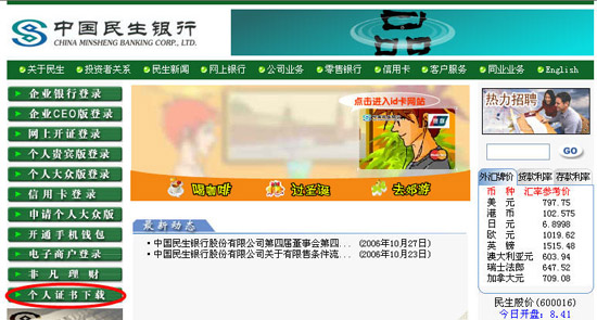 打开民生银行银行的首页,点击左侧菜单的个人证书下载