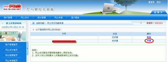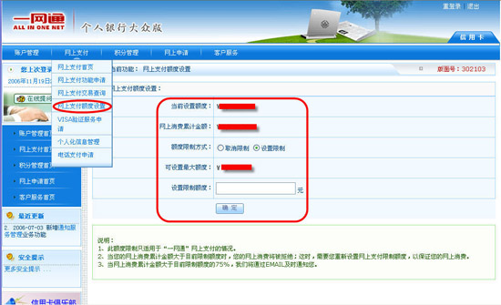 7、开通了网上支付功能后,请登陆大众版,对您的信用卡进行“网上支付额度设置”,可以“取消限置”或者“设置限制”