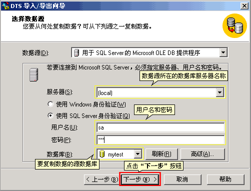 3.选择数据源,输入数据源所在的数据库服务器名称、用户名、密码和要复制数据的源数据库,点击“下一步”按钮