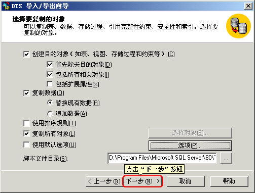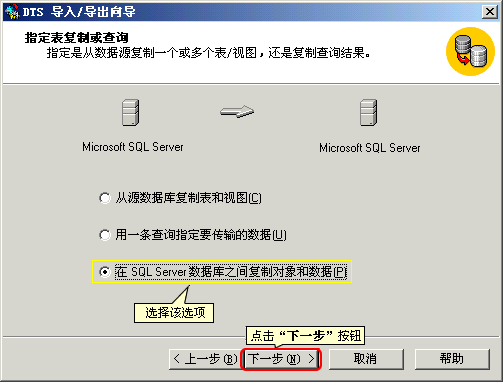 5.选择“在SQL Server数据库之间复制对象和数据”方式,点“下一步”继续