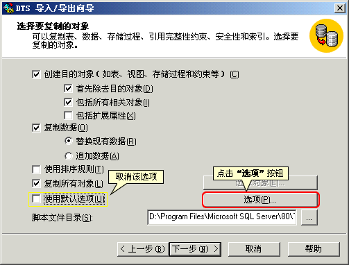 4.选择目的,输入目的数据库所在的数据库服务器名称、用户名、密码和要复制数据的目的数据库,点击“下一步”按钮
