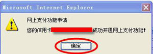 6、点击确定,您的信用卡已经成功开通了网上支付功能