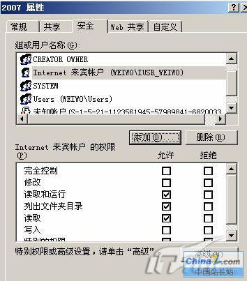 接下来我们就能对“IUSR_SERVERNAME”用户帐号权限进行有针对性设置了。在设置“IUSR_SERVERNAME”用户帐号权限时,我们先从图1所示的“组或用户名称”列表框中选中“IUSR_SERVERNAME”用户帐号,然后在对应该帐号下面的权限列表框中将“列出文件夹目录”、“写入”、“读取”等权限全部设置为“允许”,而不要将“完全控制”、“读取和运行”等权限设置为允许;此外,对于那些不需要通过Web进行写入操作的文件夹,我们只需要将“列出文件夹目录”、“读取”等权限赋予给“IUSR_SERVERNAME”用户帐号就可以了。到了这里,作为网站普通访问者的“IUSR_SERVERNAME”用户帐号就没有执行脚本的权利,那么这些普通来宾用户自然就无法对Web服务器进行各种形式的脚本攻击了,这样的话Web服务器的安全性就能在一定程度上得到保证了。