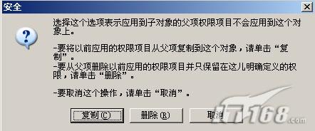 考虑到“everyone”帐号是任意一个用户或组权限设置的父对象,因此在将“everyone”帐号的访问权限删除掉之前,我们必须先将子对象对父对象权限继承关系删除掉;在删除这种权限继承关系时,我们可以单击网站主目录属性设置窗口中的“安全”标签,打开如图1所示的安全标签页面, 单击该标签页面中的“高级”按钮,进入到主目录的高级安全设置窗口,检查一下该设置窗口中的“允许父项的继承权限传播到该对象和所有子对象。包括那些在此明确定义的项目”项目是否处于选中状态,要是发现该选项已经选中的话,我们必须及时将它的选中状态取消,随后系统会自动弹出如图2所示的提示窗口, 询问我们是否将父对象的访问权限拷贝给子对象,此时我们可以单击“复制”按钮,这样的话我们日后就不需要对管理员用户的权限进行重新设置了。